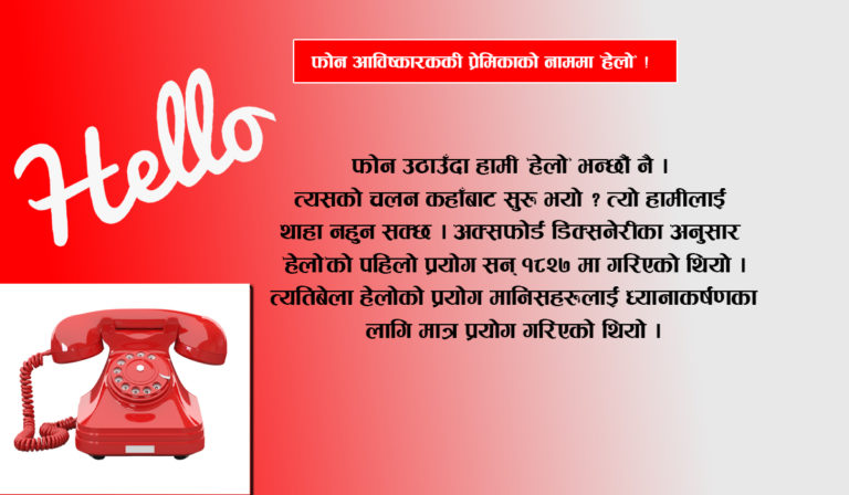 फोन उठाउँदा हामी ‘हेलो’ भन्छौं नै । त्यसको चलन कहाँबाट सुरु भयो ? त्यो हामीलाई थाहा नहुन सक्छ । अक्सफोर्ड डिक्सनेरीका अनुसार ‘हेलो’को पहिलो प्रयोग सन् १८२७ मा गरिएको थियो । त्यतिबेला हेलोको प्रयोग मानिसहरुलाई ध्यानाकर्षणका लागि मात्र प्रयोग गरिएको थियो ।