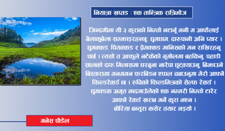 जिन्दगीमा यी ३ कुराको निम्तो नटार्नू भनी म आफैलाई बेलाकुबेला सम्झाइरहन्छुः घुमघाम, दारुपानी अनि प्यार । घुमक्कड, पियक्कड र प्रेमक्कड मानिसको मन राखिरहनु पर्छ । त्यसो त आफूले नटेकेको भूगोलमा बहकिनु, पहाडी सालको दारु गिलासमा घरबुना नारेपा घुट्क्याउनु, बिझाउने बिस्तारामा मनमगन फरबिडन एप्पल चबाउनुमा मेरो आफ्नै फिल्डरेकर्ड छ । रुचिको फिल्डभित्रको सेल्फ रेकर्ड । घुमक्डक अमृत भादगाउँलेको एक नम्मरी निम्तो टारेर आफ्नै रेकर्ड खराब गर्ने कुरा भएन । बोरिया बन्तुरा कसेर तयार भइयो ।