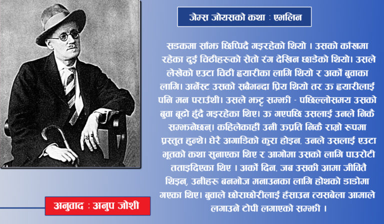 जेम्स जोयस (१८८२-१९४१) एक विश्वप्रसिद्ध आइरिस उपन्यासकार, कथाकार तथा कवि थिए । ‘स्ट्रीम अफ कन्ससनेस‘ लेखक पद्धतिको विकास गरेका उनलाई पश्चिमी साहित्यमा चलेको आधुनिकतावादी आन्दोलनको प्रभावशाली अभियन्ता मानिन्छ । बीसौं शताब्दीको महत्वपूर्ण लेखकका रुपमा प्रसिद्धि कमाएका उनका सर्वाधिक लोकप्रिय कृतिमा ‘डुब्लिनर्स’ र ‘उलिसस‘ पर्छन् । सन् १९१४ मा पहिलोपल्ट प्रकाशित जेम्स जोयसको विश्वप्रसिद्ध कथासङ्ग्रह ‘डुब्लिनर्स‘मा संग्रहित कथा ‘एभलिन‘लाई अनुप जोशीले नेपाली अनुवाद गरेका हुन् ।