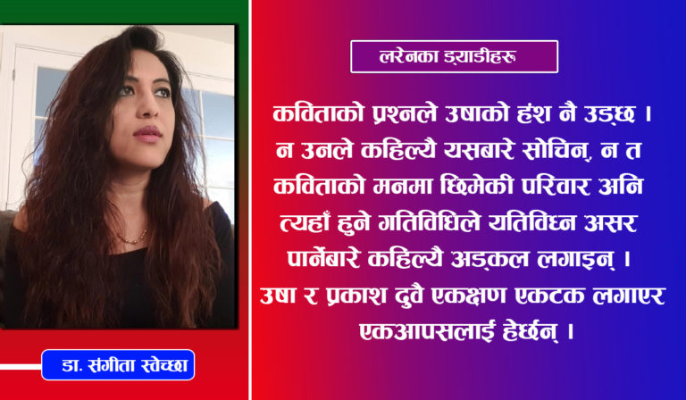 कविताको प्रश्नले उषाको हंश नै उड्छ । न उनले कहिल्यै यसबारे सोचिन्, न त कविताको मनमा छिमेकी परिवार अनि त्यहाँ हुने गतिविधिले यतिविध्न असर पार्नेबारे कहिल्यै अड्कल लगाइन् । उषा र प्रकाश दुवै एकक्षण एकटक लगाएर एकआपसलार्इ हेर्छन् ।
