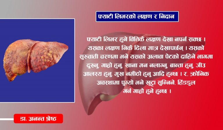 डा. अनन्त श्रेष्ठ : पछिल्लो समय धेरै मानिसमा फ्याटी लिभरको समस्या देखिएको छ । यो समस्यालाई बेवास्ता गर्दा कलेजोको क्यान्सरका बिरामी समेत बढेका छन् । फ्याटी लिभर भनेको कलेजोमा बोसो जम्ने समस्या हो । अस्वस्थ खानपान, व्यस्त जीवनशैली र मोटोपनका कारण यो समस्या दिनानुदिन बढिरहेको छ । साधारण मानिसमा उसको कलेजोको आकार अनुसार लगभग ५ प्रतिशतभन्दा कम बोसो जमेको छ भने त्यसलाई सामान्य रुपमा लिइन्छ । तर सोभन्दा बढी बोसो भएको अवस्थालाई फ्याटी लिभर मानिन्छ ।