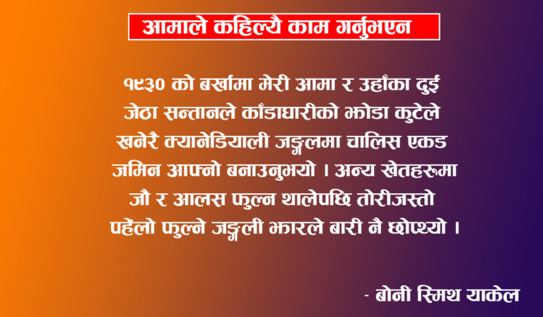 १९३० को बर्खामा मेरी आमा र उहाँका दुई जेठा सन्तानले काँडाघारीको झोडा कुटेले खनेरै क्यानेडियाली जङ्गलमा चालिस एकड जमिन आफ्नो बनाउनुभयो । अन्य खेतहरूमा जौ र आलस फुल्न थालेपछि तोरीजस्तो पहेंलो फुल्ने जङ्गली झारले बारी नै छोप्थ्यो । आमा त्यस झारका प्रत्येक बोटलाई दिनभरि निमेक लगाएर उखेल्नुहुन्थ्यो । खुकुराका पाँच सय चल्लाको बथान पाल्न थाल्नुभयो । बारी खन्नुभयो, अन्नबाली लाउनुभयो, जोत्नुभयो र आधा एकडभन्दा ठूलो बारीको बाली एक्लै थन्क्याउनुभयो ।