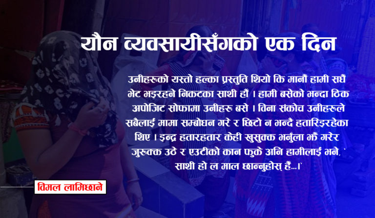 ‘भान्जी चार थान माल लिएर अस्तिको ठाउँमा आऊ है । हाम्रो एक राउन्ड चिया नसकिँदै हल्का मेकअपमा सजिएका सेतो र खैरो कपाल फररर छाडेका छोटो स्कट र जालिदार कमिज लगाएका चार युवतीको प्रस्थान भयो ।