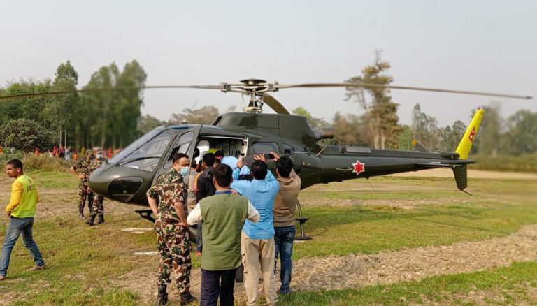 काठमाडौं, १ चैत्र । सिरहाको लहान बम बिस्फोटमा परी गम्भीर घाइते भएका दिनेशकुमार भण्डारीलाई उपचारको लागि काठमाडौं ल्याईएको छ । उनलाई नेपाली सेनाको हेलिकप्टरमार्फत काठमाडौं ल्याईएको हो । घाईते घण्डारीको तिघ्रा पिठ्यूँसहित शरीरका विभिन्न अंगमा बमको छर्रा लागेको छ।