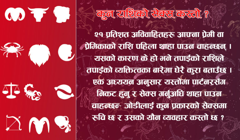 २१ प्रतिशत अविवाहितहरू आफ्ना प्रेमी वा प्रेमिकाको राशि पहिला थाहा पाउन चाहन्छन् । यसको कारण के हो भने तपाईंको राशिले तपाईंको व्यक्तित्वका बारेमा धेरै कुरा बताउँछ । एक अध्ययन अनुसार यस्तोमा पार्टनरसँग निकट हुनु र सेक्स गर्नुअघि थाहा पाउन चाहन्छन्- जोडीलाई कुन प्रकारको सेक्समा रुचि छ र उसको यौन व्यवहार कस्तो छ ?