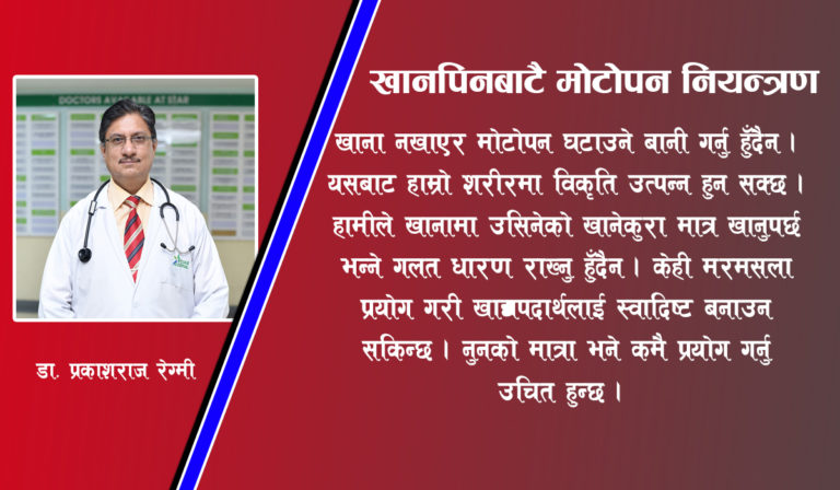 डा. प्रकाशराज रेग्मी : अव्यवस्थित जीवनशैली र खानपिनले मोटोपनको समस्या हुनेहरू दिनप्रतिदिन बढिरहेका छन् । असहज तरिकाले बढेको मोटोपन घटाउन धेरै मानिस विभिन्न औषधिको प्रयोग गर्ने गर्छन् । तर, हामीले खानेकुरा र जीवनशैलीमा सामान्य परिवर्तन गर्न सकियो भने मोटोपनबाट बच्न सकिन्छ । हाम्रो शरीरलाई स्वस्थ राख्न सबैभन्दा ठूलो कुरा जीवनशैली हुन्छ । अव्यवस्थित जीवनशैलीका कारण मोटोपन मात्र होइन, अन्य विभिन्न रोग पनि लाग्न सक्छ । त्यसैले खानपिन र व्यायाम सबैभन्दा महत्त्वपूर्ण हुन्छ ।