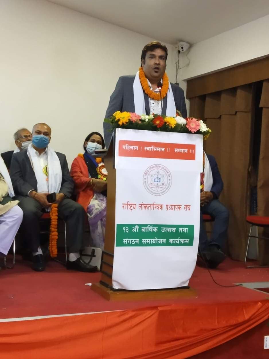 कार्यक्रममा बोल्दै संघका महासचिव तथा उप–प्राध्यापक उदय कुमार कर्णले चैत ४ गते सम्पन्न वार्षिकउत्सव कार्यक्रममा लोकतान्त्रिक प्रध्यापक संघ र समाजवादी प्राध्यापक मञ्चबीच एकता सम्पन्न भएको बताए । उनले भने, ‘लोकतान्त्रिक प्रध्यापक संघ विशुुद्व रुपमा उच्च शिक्षा विश्व विद्यालयमा अध्यापन गर्ने एउटा प्रागिक संस्था हो ।’ उनले उच्च शिक्षामा समावेसी र समानुपातिक प्रवेशको सुनिश्चित्ता लगायत शैक्षिक आदर्शप्रति समर्पित भएर लागेको संस्था भएको जिकिर गरे ।