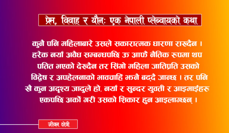 उसका नियमित शिकार ती महिलाहरुबारे उसले विस्तृत विवरण दिन्छ । कतै अनौठो त कतै दिगमिग लाग्ने उसको कहानी सुन्दै जाँदा मलाई लाग्छ, यो मानिसमा या त मानसिक समस्या छ, हैन भने पुरुष हर्मोनको अधिकता हुने कुनै शारीरिक समस्या नै छ । फर्केर हेर्दा लाग्छ, मनोरोग विज्ञानमा जेलाई हाइपोमेनिया भनिन्छ, शायद त्यो मानिसको अन्तहीन मुस्कान र महिलाहरुलाई आकर्षित गर्ने क्षमतालाई त्यसले व्याख्या गर्न सक्छ ।