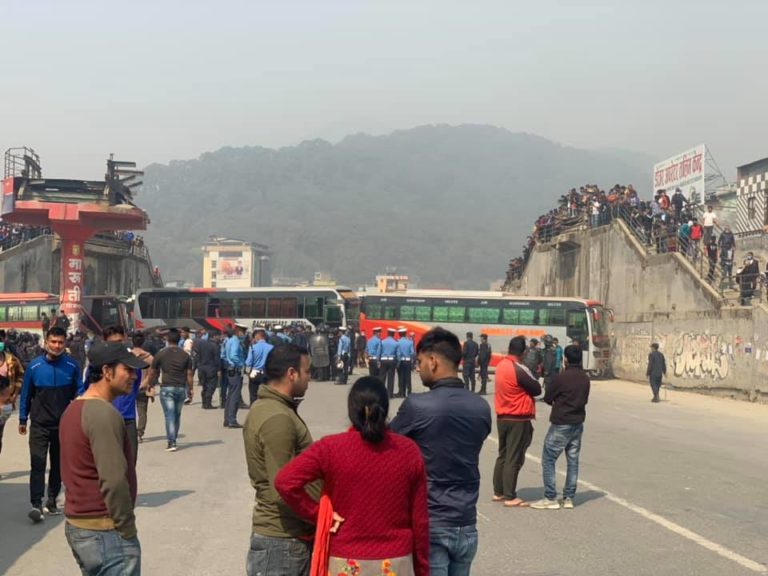 काठमाडौं, चैत ९ ।राजधानीको नयाँ बसपार्कमा ट्राफिक प्रहरीले पाँच हजारको जरिवाना (चिट) काटेको भन्दै पुरै रोड नै जाम हुनेगरि गाडि तेर्साइएको छ । ट्राफिक नियम भन्दा बाहिरगएर सवारी चलाएको पाईएपछि ट्राफिक प्रहरीले जरिवाना काटेको थियो ।