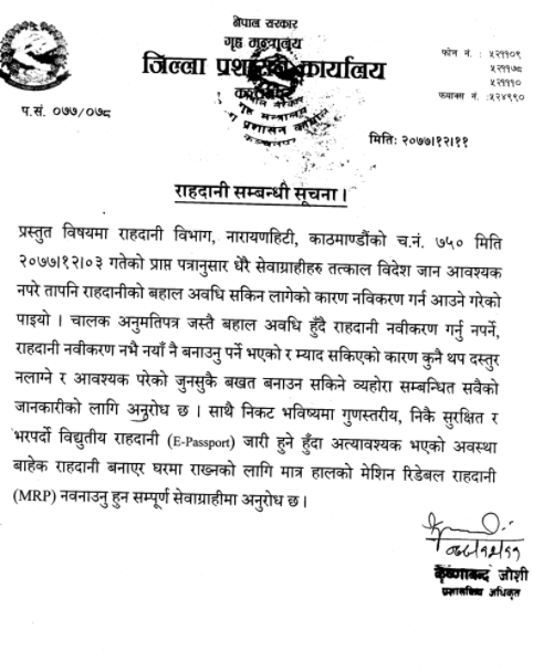 विज्ञप्तिमा भनिएको छ,’ चालक अनुमति पत्र जस्तै समय अवधि हुँदै राहदानी नवीकरण गर्नु नपर्ने, राहदानी नवीकरण नभइ नयाँ बनाउनु पर्ने भएको र म्याद सकिएको कारण कुनै थप दस्तुर नलाग्ने र आवश्यक परेको बेला जुनसुकै समय बनाउन सकिन्छ।‘