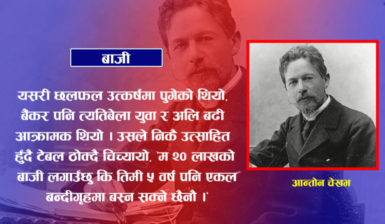 यसरी एउटा जङ्गली र अनर्थक बाजी लगाइयो । बैंकर यस्तो खराब, बेबकुफ बाजी जसमा उसका लागि २० लाख केही पनि थिएन, अत्यन्त खुशी थियो । उसले रात्रिभोजमा युवकलाई गिज्याउँदै भन्यो, ‘अझै राम्रो सँग सोच, अझै समय छ । २० लाख त मेरालागि तुच्छ हो तर तिमी बेकारमा आफ्नो अमूल्य ३-४ वर्ष त्यसै खेर फाल्दै छौ । मैले ३-४ वर्ष भनेँ किनभने तिमी त्योभन्दा बढी बस्न सक्ने छैनौ । हे दु:खी आत्मा, अनिवार्य कैदभन्दा स्वैच्छिक कैद काट्न धेरै गाह्रो हुन्छ । तिमी स्वतन्त्र भएर बाँच्ने अधिकारको विचारले मात्र पनि तिमीलाई कैदमा तिम्रो सम्पूर्ण अस्तित्वलाई विषाक्त गर्ने छ, मलाई क्षमा गर ।’