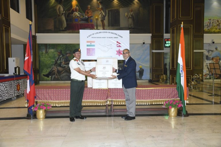 काठमाडौ., १७ चैत्र । भारतीय सेनाले नेपाली सेनालाई उपहारस्वरुप कोभिड १९ विरुद्धको एक लाख डोज खोप प्रदान गरेको छ । दूतावासले प्रेस विज्ञप्ती जारी गर्दै भनेको छ,”गत जनवरीमा ‘खोप मैत्री’ कार्यक्रम अन्तर्गत नेपाललाई दश लाख कोभिड–१९ विरुद्धको खोप प्रदान गरे पश्चात फेरि पनि भारतीय सेनाले नेपाली सेनालाई थप एक लाख कोभिड–१९ विरुद्धको कोभिशिल्ड खोप उपहारस्वरुप प्रदान गरेको छ । भारतले अघि बढाएको यो प्रयास दुई देशबीचको विशेष सम्बन्धको अर्को एक अनुपम उदाहरण हुनुका साथै यसले भारतले आफ्नो छिमेकी प्रति देखाएको सदाशयतालाई पनि पुष्टि गरेको छ ।”