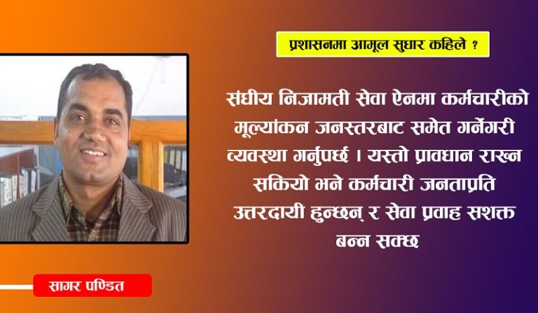 संघीय निजामती सेवा ऐनमा कर्मचारीको मूल्यांकन जनस्तरबाट समेत गर्नेगरी व्यवस्था गर्नुपर्छ । यस्तो प्रावधान राख्न सकियो भने कर्मचारी जनताप्रति उत्तरदायी हुन्छन् र सेवा प्रवाह सशक्त बन्न सक्छ ।