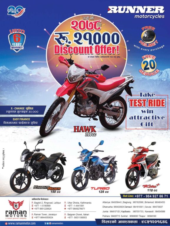 काठमाडौं, ३० चैत्र । बंगलादेशको प्रतिष्ठित ब्राण्ड रनर मोटरसाईकलले नेपाली नयाँ वर्षलाई लक्षीत गरी ’नयाँ वर्ष नयाँ डिस्काउन्ट अफर’ ल्याएको छ । कोरोनाको लामो कहर पछी केही सामान्य हुँदै आएको नेपाली अटो बजारलाई तप उर्जा प्रदान गर्न रमण मोटर्सले प्रत्येक रनर मोटरसाईकलको खरिदमा सिधै नगद रु २१,००० छुत दिने भएको छ ।
