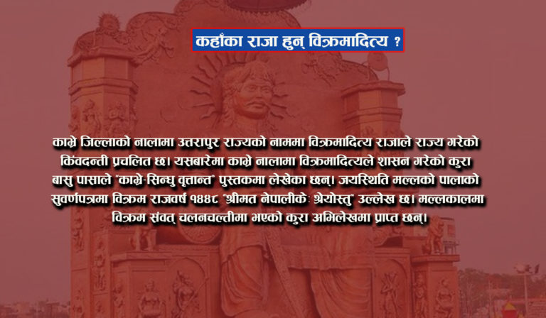 काभ्रे जिल्लाको नालामा उत्तरापुर राज्यको नाममा विक्रमादित्य राजाले राज्य गरेको किंवदन्ती प्रचलित छ। यसबारेमा काभ्रे नालामा विक्रमादित्यले शासन गरेको कुरा बासु पासाले ‘काभ्रे-सिन्धु वृत्तान्त’ पुस्तकमा लेखेका छन्।। जयस्थिति मल्लको पालाको सुवर्णपत्रमा ‘विक्रम राजवर्ष १४४८ श्रीमत नेपालीकेः श्रेयोस्तु’ उल्लेख छ। मल्लकालमा विक्रम संवत् चलनचल्तीमा भएको कुरा अभिलेखमा प्राप्त छन्।