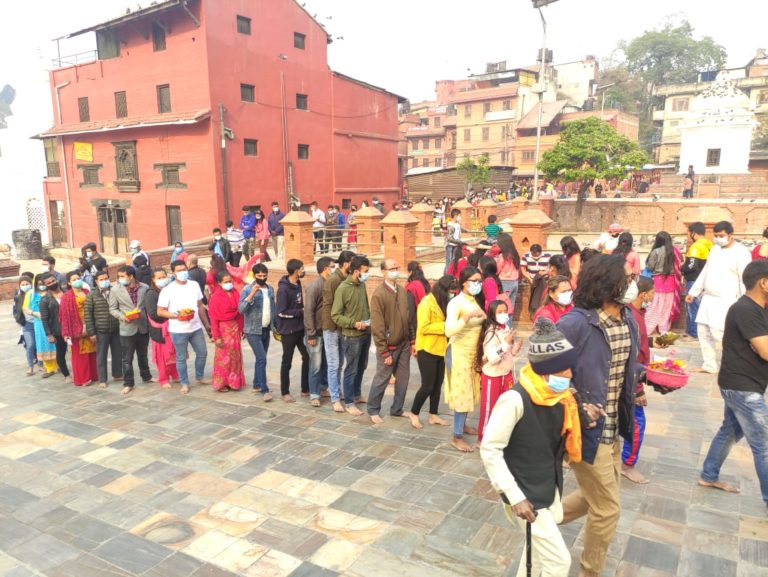 काठमाडौं, १ बैशाख । पशुपतिनाथ मन्दिरलगायत देशभरका मन्दिरमा पूजा आराधना एवं दर्शनका लागि भक्तजनको भीड लागेको थियो । भीडभाड भई रोग सर्न सक्ने भएकाले सजगता अपनाउँदै धेरै मन्दिरमा दर्शन गर्न भक्तजन लाममा बसेका थिए । पशुपतिनाथ मन्दिरमा भौतिक दूरी कायम गरी स्वास्थ्य सुरक्षाका मापदण्ड अपनाएर भक्तजनलाई दर्शन गराइएको पशुपति क्षेत्र विकास कोषका कार्यकारी निर्देशक डा घनश्याम खतिवडाले जानकारी दिए।