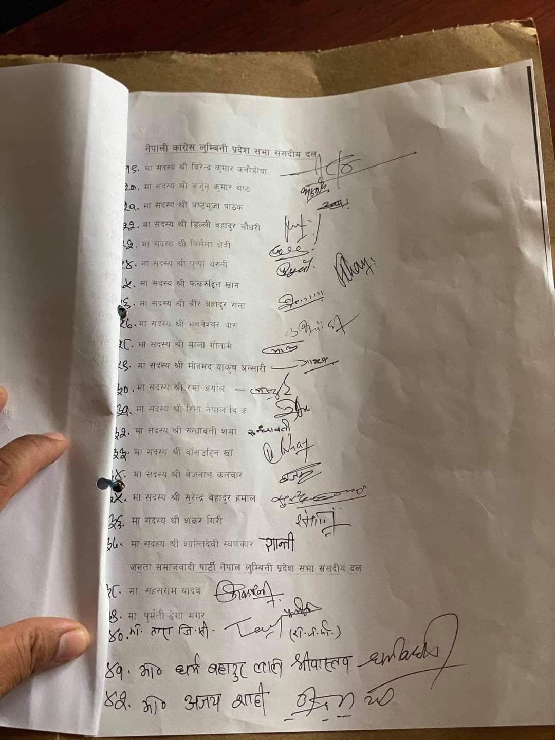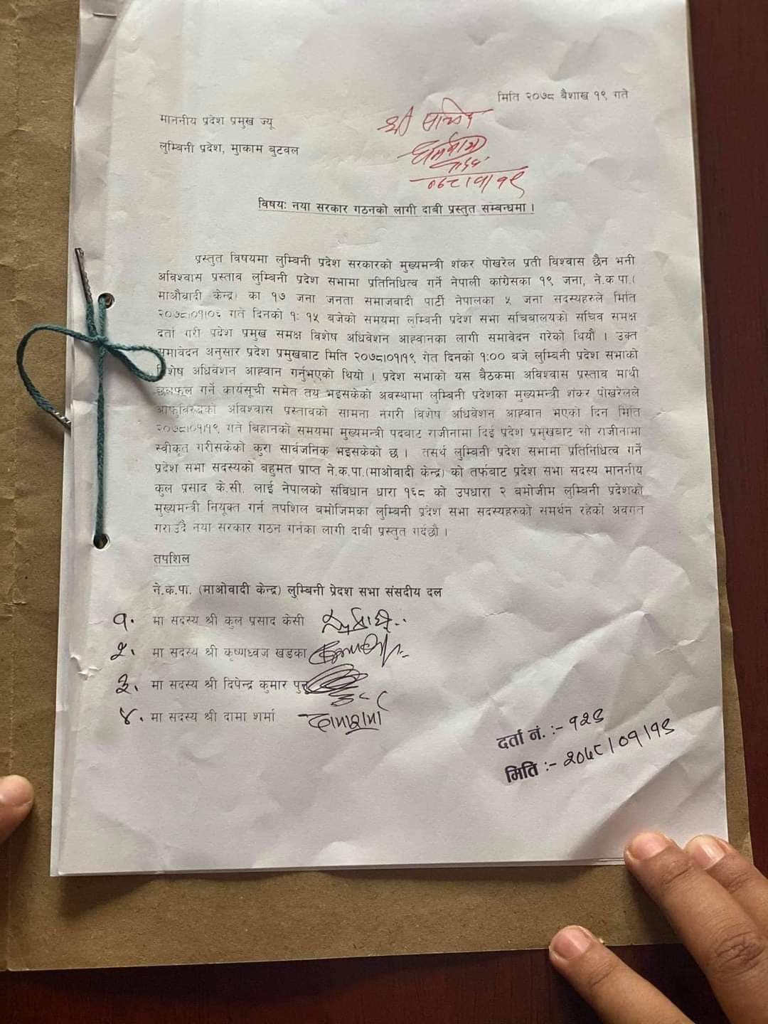 काठमाडौं, १९ बैशाख । लुम्बिनी प्रदेश सभाका ४२ सांसदले प्रदेश प्रमुख धर्मनाथ यादवसमक्ष शंकर पोखरेललाई मुख्यमन्त्रीको रुपमा सपथ नगराउन माग गरेका छन् । उनीहरुको पत्र प्रदेश प्रमुख यादवले बुझिसकेका छन् । उनीहरु सशरिर प्रदेश कार्यालयमा उपस्थित् थिए ।