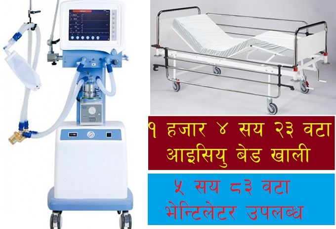 विहिबारसम्मको सरकारी तथ्याङ्कअनुसार देशभर १ हजार ४ सय २३ वटा आइसियु बेड खाली रहेको छ । त्यसैगरी ५ सय ८३ वटा भेन्टिलेटर उपलब्ध रहेको स्वास्थ्य तथा जनसंख्या मन्त्रालयको तथ्याङ्कमा उल्लेख छ ।
