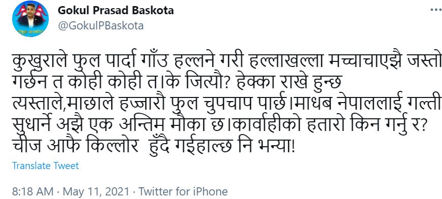 उनले लेखेका छन्-“कुखुराले फुल पार्दा गाँउ हल्लने गरी हल्लाखल्ला मच्चाचाएझै जस्तो गर्छन त कोही कोही त।के जित्यौ? हेक्का राखे हुन्छ त्यस्ताले,माछाले हज्जारौ फुल चुपचाप पार्छ।माधब नेपाललाई गल्ती सुधार्ने अझै एक अन्तिम मौका छ।कार्वाहीको हतारो किन गर्नु र?चीज आफै किल्लोर हुँदै गईहाल्छ नि भन्या!”