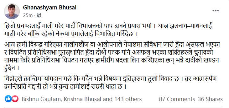 भुषालले लेखेका छन्-“हिजो प्रचण्डलार्ई गाली गरेर पार्टी विभाजनको पाप ढाक्ने प्रयास भयो । आज झलनाथ–माधवलार्ई गाली गरेर बाँकि रहेको नेकपा एमालेलाई विभाजित गरिँदैछ ।आज हामी विरुद्ध गरिएका गालीगलौज वा आलोचनाले नेपालमा संविधान जारी हुँदा असफल भएका र विघटित प्रतिनिधिसभा पुनस्र्थापित हुँदा दोश्रो पटक पनि असफल भएका शक्तिहरुले चुनावको नाममा फेरि प्रतिनिधिसभा विघटन गराएर हामीसँग बदला लिन कस्सिएका छन् भन्ने दावीको खण्डन हुँदैन । विद्रोहले क्रान्तिमा योगदान गर्छ कि गर्दैन भन्ने विषयमा इतिहासमा ठूलो विवाद छ । तर आत्मसर्पण क्रान्तिप्रति गद्दारी हो भन्ने कुरा हामीलाई राम्ररी थाहा छ ।”