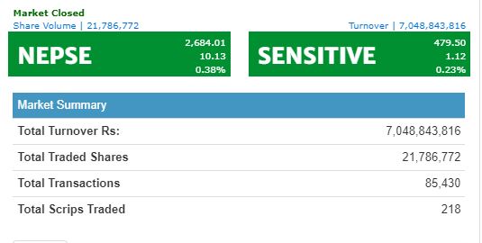 आज व्यापार, होटल तथा टुरिजम, म्यानुफ्याक्चरिङ तथा उत्पादा र इन्भेष्टमेन्ट उपसमुहको बाहेक ९ समुहका सुचक बढेका छन् । नेप्से परिसुचक अनुसार आज २१८ कम्पनीको ८५ हजार ४३० पटक कारोबार ७ अर्ब ४८ करोड ८४ लाख ३ हजार ८१६ रुपैयाँ बराबरको २ करोड १७ लाख ८६ हजार ७७२ प्रतिकित्ता शेयर खरिद विक्रि भएको छ ।