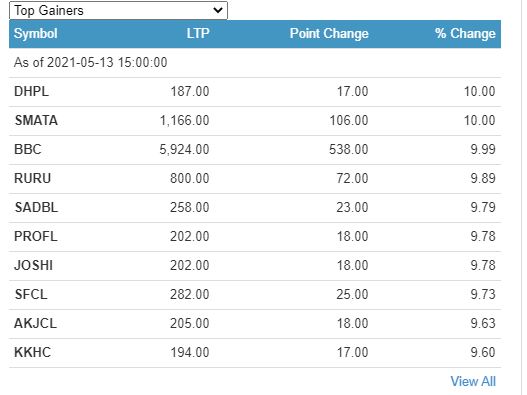 नेप्सेको अनुसार आज बिशाल बजार कम्पनीको शेयरमुल्य ९.९९ प्रतिशतले बढेको छ । रुरु जलविद्युत आयोजना, सांग्रिला डेभलपमेन्ट बैंक, प्रोगेसिभ फाइनान्स लिमिटेडको सर्किट लेभलमा कारोबार भएका छन् ।