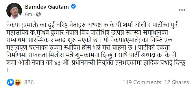 उनले लेखेका छन्-“नेकपा (एमाले) का दुई वरिष्ठ नेताहरु अध्यक्ष क.के.पी शर्मा ओली र पार्टीका पूर्व महासचिव क.माधव कुमार नेपाल विच पार्टीभित्र उत्पन्न समस्या समाधानका सम्बन्धमा प्रारम्भिक सम्बाद शुरु भएको छ । यो नेकपा(एमाले) का निम्ति एक महत्त्वपूर्ण घटनाका रुपमा स्थापित होस भन्ने मेरो चाहना छ । पार्टीको एकता निर्माणमा सफलता मिलोस भन्ने शुभकामना दिन्छु । साथै पार्टी अध्यक्ष क. के.पी. शर्मा ओली नेपाल को ४३ औं प्रधानमन्त्री नियुक्ति हुनुभएकोमा हार्दिक बधाई दिन्छु ।”