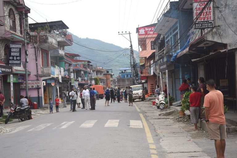 लमजुङ, ५ जेठ: लमजुङ मस्र्याङ्दी गाउँपालिका–३ स्थित भुलभुले केन्द्रविन्दु बनाएर बुधबार बिहान भूकम्प जाँदा सुरक्षाका लागि घर बाहिर सडकमा निस्केका बेँसीशहर नगरपालिका–७ का स्थानीय बासिन्दा । यसबाहेक जिल्लाका अधिकांश स्थानीय बासिन्दा घर बाहिर सकड, बाटो र खुला तथा सुरक्षित स्थानमा बसेका छन् । जिल्लामा पटक–पटक भूकम्पको धक्का महशुस भइरहँदा जिल्लावासी त्रसित बनेका छन् ।