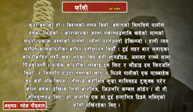 कुरा बर्माको हो । बिहानको समय थियो, बर्षातको सिमसिमे पानीले हल्का भिजेको । कारागारका अग्ला पर्खालहरूमाथि खसेको घामको मधुरो प्रकाश जस्ताको पातलो, पहेँलो परतजस्तो देखिन्थ्यो । हामी त्यस श्रापित कालकोठरीका बाहिर प्रतीक्षारत थियौँ । दुई लहर बार लगाएका कोठरीबाहिर लहरै खडा भएका थिए केही झुपडीहरू, जनावर राख्ने साना पिँजडाजस्तै । प्रत्येक कोठरीको लम्बाइ दस फिट र चौढाइ दस फिटजति थियो, र भित्रपटि एउटा तख्ताको खाट र पिउने पानीको एक पात्रबाहेक अरु केही पनि थिएन । तीमध्ये केहीभित्र फुस्रा मानिसहरू टुक्रुक्क परेर शान्त बसेका देखिन्थे भित्री बारभित्र, जिउभरि कम्बल ओढेर । यी ती अभियुक्तहरू थिए, जो आगामि एक वा दुई हप्ताभित्र दिइने भनिएको फाँसी पर्खिरहेका थिए ।