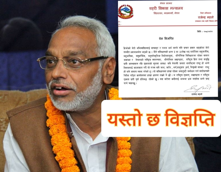 जेठ २३, काठमाण्डौ । उपप्रधानमन्त्रीसमेत रहेका सहरी विकासमन्त्री राजेन्द्र महतोले आफ्नो विवादास्पद अभिव्यक्ति सच्याएका छन् ।