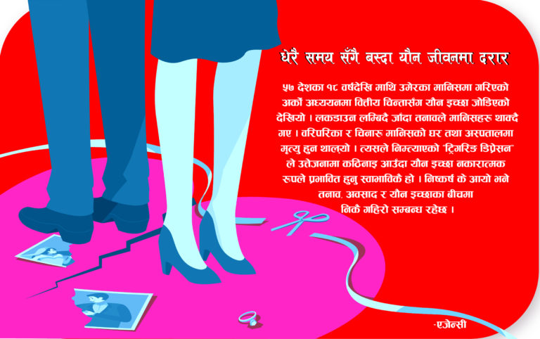 ५७ देशका १८ वर्षदेखि माथि उमेरका मानिसमा गरिएको अर्को अध्ययनमा वित्तीय चिन्तासँग यौन इच्छा जोडिएको देखियो । लकडाउन लम्बिदै जाँदा तनावले मानिसहरु थाक्दै गए । वरिपरिका र चिनारु मानिसको घर तथा अस्पतालमा मृत्यु हुन थाल्यो । त्यसले निम्त्याएको ‘ट्रिगरिङ डिप्रेसन’ ले उत्तेजनामा कठिनाइ आउँदा यौन इच्छा नकारात्मक रूपले प्रभावित हुनु स्वाभाविकै हो । निष्कर्ष के आयो भने तनाव, अवसाद र यौन इच्छाका बीचमा निकै गहिरो सम्बन्ध रहेछ ।