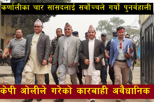 नेकपा (एमाले) को झलनाथ खनाल–माधवकुमार नेपाल पक्षका कर्णाली प्रदेश सभा सदस्यहरू प्रकाश ज्वाला, कुर्मराज शाही, अम्मरबहादुर थापा र नन्दसिंह बुढाको पद सर्वोच्च अदालतका न्यायाधीश प्रकाशमानसिंह राउतको एकल इजलासले पुनर्बहाली गरेको हो । एमालेको केन्द्रीय समितिको निर्णयमा नभई महाधिवेशन आयोजक समितिको निर्णयका आधारमा स्पष्टीकरण नमागिएको र महाधिवेशन आयोजक कमिटी कारबाहीका लागि आधिकारिक नभएको आदेशमा लेखिएको छ ।
