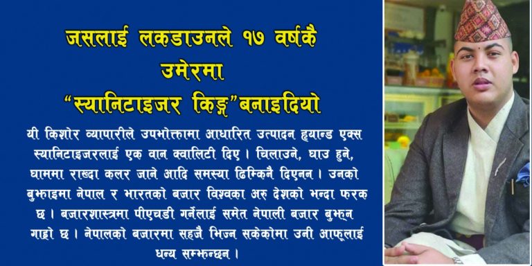 रिपोर्टर्स नेपाल : कोभिड–१९ का कारण २०७६ चैतमा लकडाउन नभएको भए प्रणवजंग पाण्डे यतिबेला कि काठमाडौँमा बीबीए पढिरहेका हुन्थे कि विदेश पुगिसकेका हुन्थे । तर लकडाउनले उनलाई ‘कान्छा व्यापारी’का रुपमा चिनाइदियो ।पहिलो खेपको लकडाउन उनको जीवनमा साँच्चै ‘टर्निङ प्वाइन्ट’ बनेर आयो । १७ वर्षे प्रणव कक्षा १२ मा ग्लोबल कलेज अफ म्यानेजमेन्टमा पढ्दै थिए । … Continue reading प्रोफाइल : जसलाई लकडाउनले १७ वर्षकै उमेरमा ‘स्यानिटाइजर किङ’ बनाइदियो