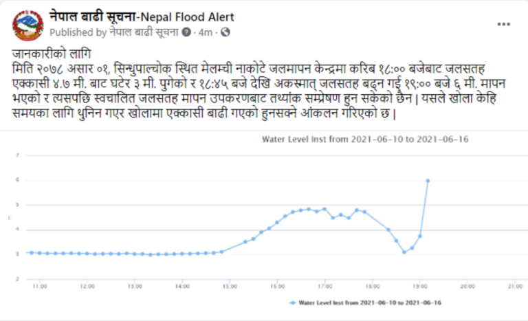 १ असारमा सिन्धुपाल्चोकस्थित मेलम्ची नाकोटे जलमापन केन्द्रमा करिब ६ बजेबाट जलसतह एक्कासी ४.७ मिटरबाट घटेर ३ मिटर पुगेको र पौने ७ बजे देखि अकस्मात् जलसतह बढ्न गई ७ बजे ६ मिटर मापन भएको नेपाल बाढी सूचनाले जानकारी दिएको छ । त्यसपछि स्वचालित जलसतह मापन उपकरणबाट तथ्यांक सम्प्रेषण हुन नसकेको उल्लेख छ ।