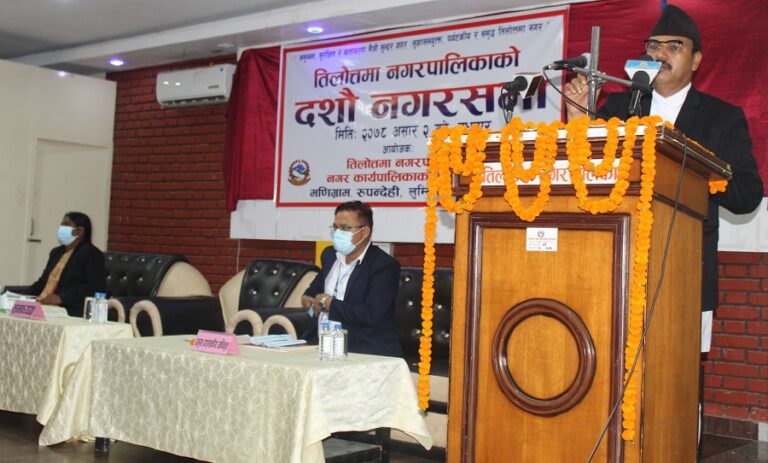 — नीरा गौतम रुपन्देही, २ असार : रुपन्देहीको तिलोत्तमा नगरपालिकाले आगामी आर्थिक वर्ष २०७८-७९ का लागि स्वास्थ्य क्षेत्रलाई मुख्य प्राथमिकतामा राखेर नीति तथा कार्यक्रम सार्वजनिक गरेको छ । नगरप्रमुख वासुदेव घिमिरेले आज दशौँ नगरसभाको पहिलो बैठकमा ‘समृद्ध नगर : खुशी नगरवासी’ लक्ष्य रहेको स्थानीय सरकारको नीति तथा कार्यक्रम सार्वजनिक गर्नुभएको हो ।