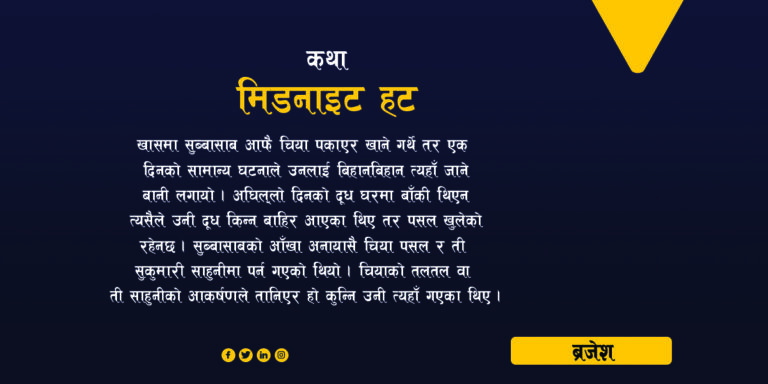 ब्रजेश : उमेरको ५० वर्ष छुने बेलामा सुब्बासाबलाई कुर्कुरे वैंश आएजस्तो भइरहेको छ । उनको खास नाम र थर के हो भन्ने पनि धेरैलाई त थाहा छैन । जागीरमा सुब्बा भएको कारण उनलाई साथीहरु सबैले सुब्बा सुब्बा भन्दा भन्दै अहिले त उनलाई नै पनि आफ्नो नाम त्यही जस्तो लाग्न थालेको छ ।रातभरि पनि उनी राम्ररी निदाउन सकेनन् । निदाउन निदाउन खोज्यो, सपनामा त्यही कुरा देखेर झसंग भएर ब्यूँझिहाल्थे सुब्बासाब । आज बिहानैदेखि सुब्बासाब उत्साहित छन् । उत्साहित मात्र होइन, उत्तेजित पनि भन्नुपर्ला । अनि अलिअलि डर पनि छ उनलाई ।