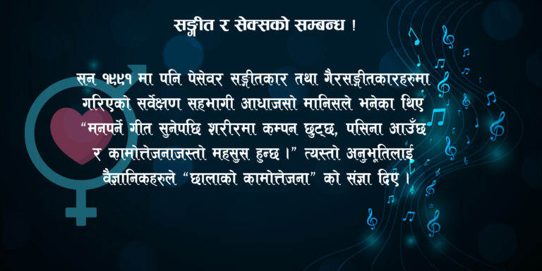 सन् १९९१ मा पनि पेसेवर सङ्गीतकार तथा गैरसङ्गीतकारहरुमा गरिएको सर्वेक्षण सहभागी आधाजसो मानिसले भनेका थिए- ‘मनपर्ने गीत सुनेपछि शरीरमा कम्पन छुट्छ, पसिना आउँछ र कामोत्तेजनाजस्तो महसुस हुन्छ ।’ त्यस्तो अनुभूतिलाई वैज्ञानिकहरुले ‘छालाको कामोत्तेजना’ को संज्ञा दिए ।