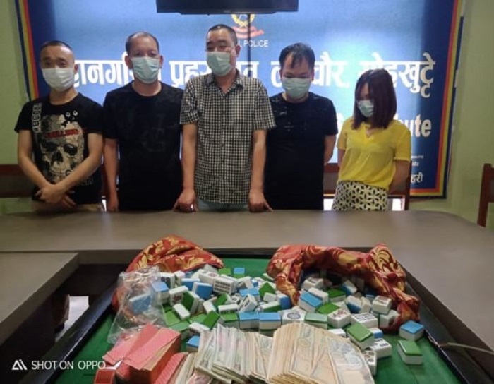 काठमाडौं, २४ असार । प्रहरीले जुवा खेलेको आरोपमा पाँच चिनियाँ नागरिकलाई बुधबार पक्राउ गरेको छ । काठमाडौं महानगरपालिका २६ ठमेल जेपी मोडस्थित होटलमा तास खलिरहेको अवस्थामा होटल संचालक चिनियाँ नागरिक राहदानी नम्बर ई ९९८३३१२३ बहाक HE.XIAOLOMG समेत ५ जनालाई बुधबार राति प्रहरीले पक्राउ गरेको हो ।