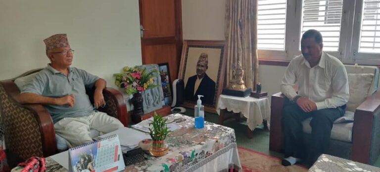 काठमाडौं, ३१ असार । नेकपाका महासचिव नेत्रविक्रम चन्द ‘विप्लव’ले नेकपा (एमाले) का वरिष्ठ नेता माधव कुमार नेपाललाई भेटेका छन् । नेता नेपालको कोटेश्वरस्थित् निवासमा पुगेर महासचिव विप्लवले आज भेटवार्ता गरेका हुन् । हिजोमात्रै विप्लवले नेकपा (माओवादी केन्द्र) का अध्यक्ष पुष्पकमल दाहाललाई भेटेका थिए ।