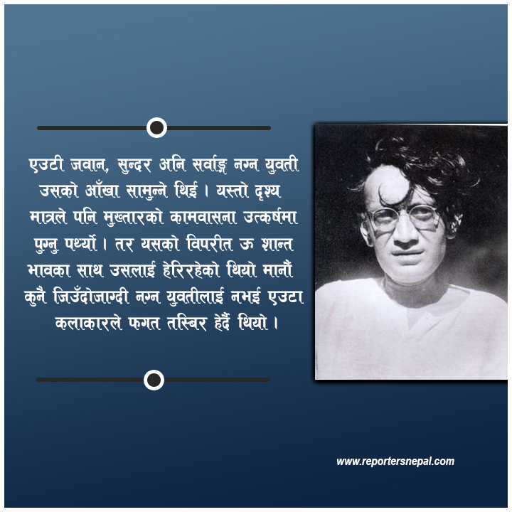 शारदाका आँखामा सपनाहरू तैरिन थाले । मुख्तार बोलिरह्यो, ‘मैले त्यस दिन तिमीलाई झ्यालबाट नुहाउँदै गरेको देखें… । होइन, तिमी आफैं देखियौ । त्यो यस्तो दृश्य थियो जसलाई म मृत्युपर्यन्त बिर्सन सक्दिनँ । किन लजाउँछौ तिमी ? मेरा आँखाहरूले तिम्रो सौन्दर्य चोरी त गरेका छैनन् नि ! तिम्रो सौन्दर्यको तस्बिर मात्र मेरो आँखामा समाहित भएको छ । त्यस तस्बिरलाई तिमीले जिउँदो जाग्दो बनाइदियौ भने म तिम्रो पाइताला चुम्ने छु !’ यस्तो भनेर मुख्तारले शारदाको एउटा पाउमा चुम्बन गर्यो ।
