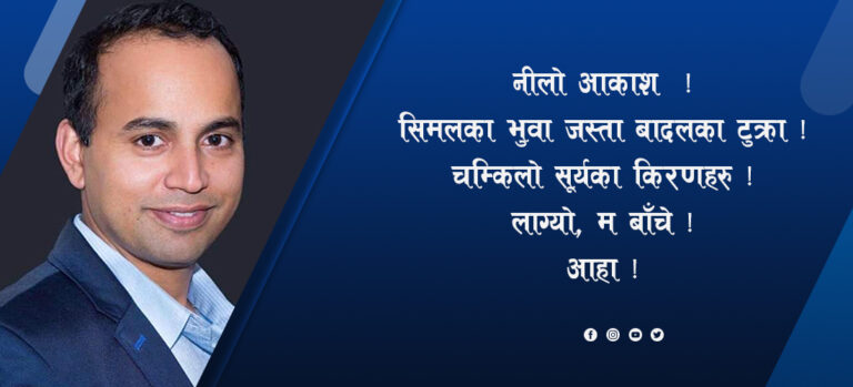 विश्वविजेताको मुस्कान लिएर चारैतिर हेरेँ । देब्रेतिर ४०–५० जना तितरबितर छरिएका । र, केही हूल मानिस गुजमुजिएका छन् । एकाध मानिस फोनमा व्यस्त छन् । अधिकांश आ–आफ्नो जीऊ मुसारिरहेका छन् । कोही सत्राम्मै भुईंमा ढलेका छन् । प्रकृतिको काखमा आफूलाई सुम्पेका छन् । एउटा अबोध दूधे बालकले आफूले आफैलाई आफ्नी आमाको काखमा निष्फिक्री सुम्पे जसरी ।
