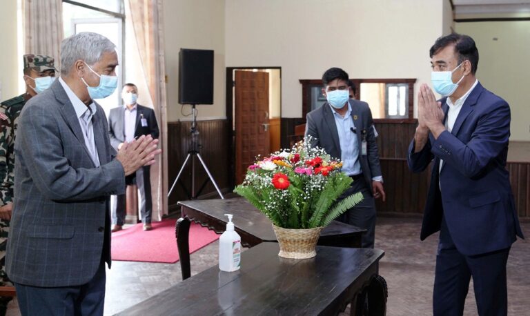 काठमाडौं, ५ साउन । नेपाल चेम्वर अफ कमर्सका अध्यक्ष राजेन्द्र मल्लको नेतृत्वमा चेम्वरका पदाधिकारीहरु तथा सदस्यद्धारा आज प्रधानमन्त्री शेर वहादुर देउवा समक्ष भेटवार्ता गरेको छ । उक्त अवसरमा अध्यक्ष मल्लले गणतन्त्र नेपालको प्रधानमन्त्री पदमा नियुक्त भएकोमा नेपाल चेम्वर अफ कमर्सको तर्फबाट बधाई तथा शुभकामना व्यक्त गर्दै सफल कार्यकालको कामना गरे ।