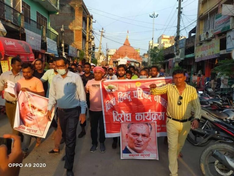 काठमाडौं, ७ साउन । विश्व हिन्दू परिषद नेपालले पूर्वप्रधानमन्त्री एवं जनता समाजवादी पार्टी (जसपा) का संघीय परिषद् अध्यक्ष डा. बाबुराम भट्टराईविरुद्ध आज देशव्यापी प्रदर्शन गरेको छ । हिन्दू धर्ममाथि प्रहार गरेको भन्दै परिषदले राजविराज, विरगंज जस्ता देशका मुख्य शहरहरूमा प्रदर्शन गरेको हो ।