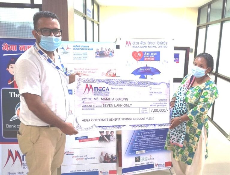 मेगा बैंकमा ‘मेगा कर्पोरेट बेनीफिट सेभिङ अकाउन्ट’ खोलेका हिमालय गुरुङका परिवारलाई मेगा बैंकले सोही खातामा भएको योजना बमोजिम बिमा बापत सात लाख रुपैँया हस्तारन्तरण गरेको हो । मेगा बैंक इटहरी शाखाका प्रबन्धक शिकन्दर थापाले स्वर्गीय ग्राहक हिमालयकी धर्मपत्नी ममिता गुरुङलाई बिमा बापतको रकम हस्तान्तरण गरे । संखुवासभा स्थायी घर भएका गुरुङको २०७७ मंसिर १ गते काठमाडौंको बालाजुमा दुर्घटनामा निधन भएको थियो ।