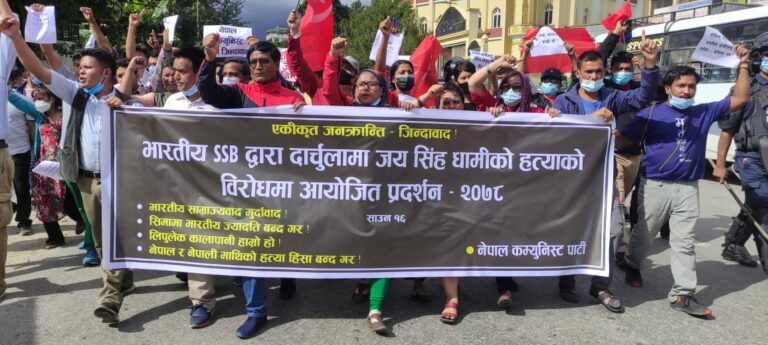 काठमाडौं, १६ साउन । नेत्रविक्रम चन्द ‘विप्लव’ नेतृत्वको नेपाल कम्युनिष्ट पार्टीले दार्चुलामा भारतीय सीमा सुरक्षा बल (एसएसबी) ले तुइन काट्दा जयसिंह धामी महाकाली नदीमा बेपत्ता भएको घटनाको विरोधमा काठमाडौँमा प्रदर्शन भएको छ ।