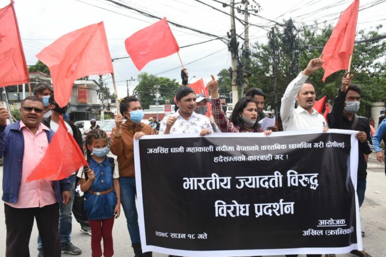 काठमाडौं, १८ साउन । अखिल (क्रान्तिकारी) ले दार्चुला घट्नाको विरोधमा नेपालस्थित् भारतीय दूतावास अघि प्रदर्शन गरेको छ । जयसिंह धामी महाकाली नदीमा बेपत्ताको बास्तविक छानबिन गरी दोषीलाई कारबाही गर्न माग गर्दै उनीहरुले पछिल्लो दिनमा प्रदर्शन गरिरहेका छन् । यसै क्रममा आज उक्त संगठनले भारतीय दूतावासअघि प्रदर्शन गरेको हो । आजको प्रदर्शनलाई संगठनले ‘भारतीय ज्यादतीविरुद्ध विरोध प्रदर्शन’ को संज्ञा दिएको छ ।