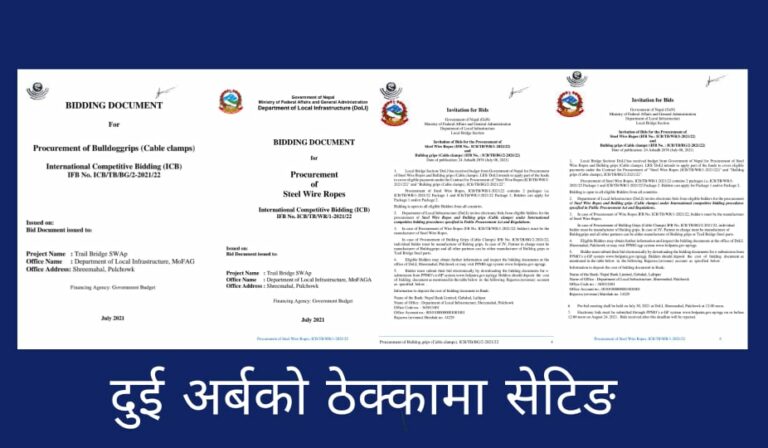 पुल निर्माणमा प्रयोग हुने स्टिल वायर डोरी र बुलडग ग्रीप्सका लागि २ अर्ब नेपाली रुपैयाँ बराबरको ग्लोबल टेन्डर २४ असारमा आव्हान गरिएको छ । जसमा बोलपत्रमा प्रतिष्पर्धी निर्माता कम्पनि नै हुनुपर्ने उल्लेख छ । टेन्डरको बुँदा नम्बर ३ मा वाइर रोपको ठेक्कामा स्टिल वाइर रोपकै निर्माता कम्पनीले मात्र प्रतिष्पर्धा गर्न पाउने भनिएको छ । बुलडग ग्रिप्समा पनि उत्पादक कम्पनी आफै मात्र प्रतिष्पर्धी बन्न सक्ने भनिएको छ ।