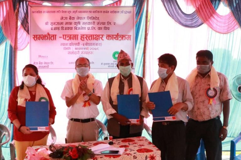 मेगा बैंक नेपाल लिमिटेड, ए एण्ड डी आक्वा बिजनेश प्राइभेट लिमिटेड र सुनगाभा माछा कृषि सहकारी संस्थाबीच माछाकृषकहरुलाई अत्याधुनिक बैंकिङ सुविधा र सहुलियतपूर्ण कर्जा प्रवाह गर्ने सम्झौता भएको हो । यस सम्बन्धी सम्झौता पत्रमा मेगा बैंकका अध्यक्ष भोजबहादुर शाहको उपस्थितिमा मेगा बैंककी सिइओ अनुपमा खुञ्जेली, ए एण्ड डी आक्वा बिजनेश प्राइभेट लिमिटेडका अध्यक्ष अमरबहादुर थिङ र सुनगाभा माछा कृषि सहकारी संस्थाका अध्यक्ष शिवहरी आचार्यले सम्झौता गरेका हुन् ।