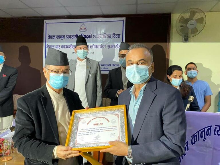 हिजो (बुधबार) नेपाल कानून व्यवसायी परिषद्को २८औं परिषद् दिवसको अवसरमा प्रधानन्यायाधीश चोलेन्द्र शमशेर जबराले डा. आचार्यलाई उक्त पुरस्कार प्रदान गरेका हुन् । पुरस्कार ग्रहण गर्दै डा. आचार्यले भनेका छन्,‘यो अवसरमा बार काउन्सिल, सम्माननीय प्रधानन्यायाधीश र सबै अग्रज शुभेच्छुकहरुमा आभार व्यक्त गर्दछु ।’