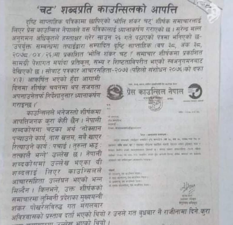 काठमाडौं, १ भदौ । लुम्बिनी प्रदेशको मुख्यमन्त्रीबाट हट्ने निश्चितप्रायः भएपछि शंकर पोखरेलबारे विभिन्न खबर आए । त्यसमध्ये दृष्टि साप्ताहिकले भोलि शंकर चट् शिर्षकमा समाचार छाप्यो । त्यसप्रति प्रेस काउन्सिलले पत्र लेखेर ध्यानकर्षण गराएको छ ।